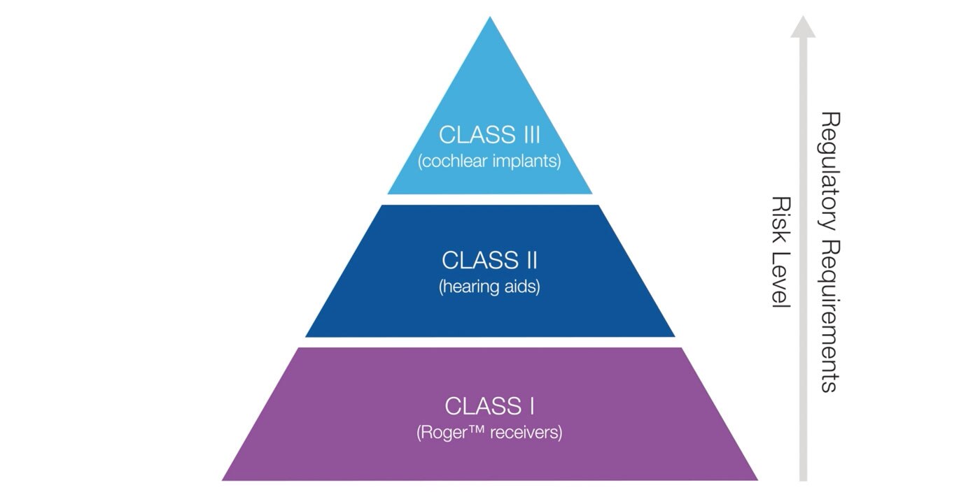 Every medical device is assigned to one of three regulatory classes based on the level of scrutiny necessary to ensure its safety and effectiveness. For example, microphone accessories are categorized as Class I while hearing aids are Class II. Cochlear implants are Class III devices with the highest risk for causing potential harm, and therefore must meet the most stringent regulatory requirements before release to the market.