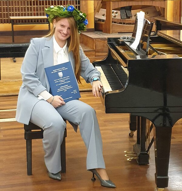 Con gran dedicación y perseverancia, a pesar de la pandemia y de las clases en línea, logré graduarme en noviembre de 2021 en el programa de piano de tres años. El título de mi tesis fue Música y discapacidad. Incluso participé en varios eventos y concursos, como el Pianocity de Nápoles, donde el público me elogió por mi carisma y sensibilidad musical. Recientemente, en el mismo conservatorio, fui admitida con honores en la maestría de dos años en piano con enfoque solista, ya que mi sueño es convertirme en una pianista profesional con una carrera internacional.